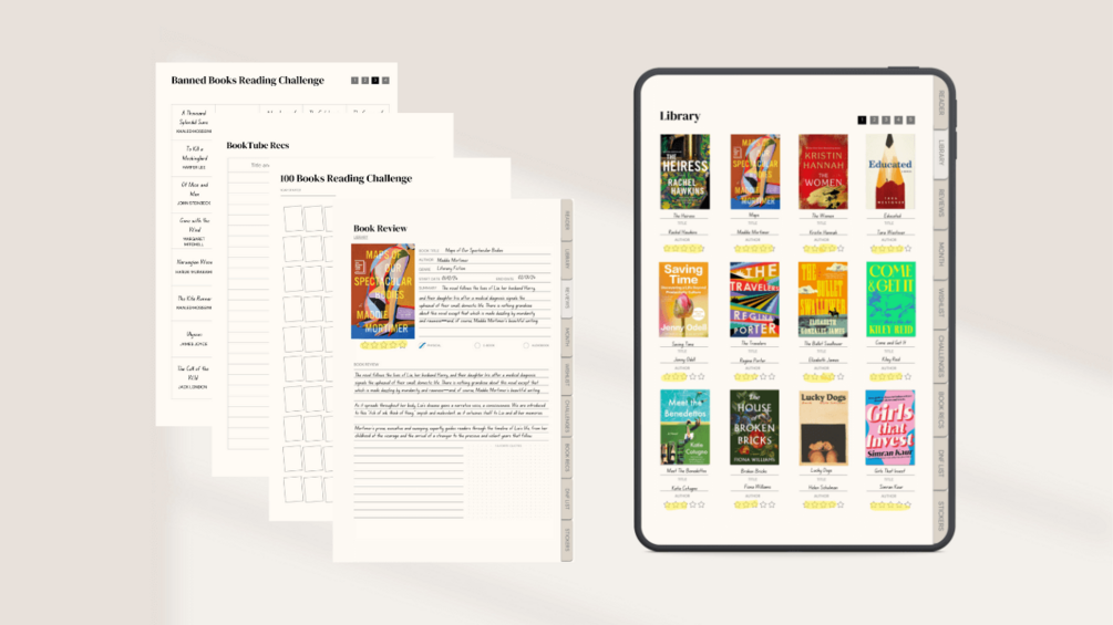 Digital PDF book journal for Goodnotes, Notability, etc. with interactive hyperlinks. Includes 50+ interactive library entries, individual book review pages, and cute stickers!